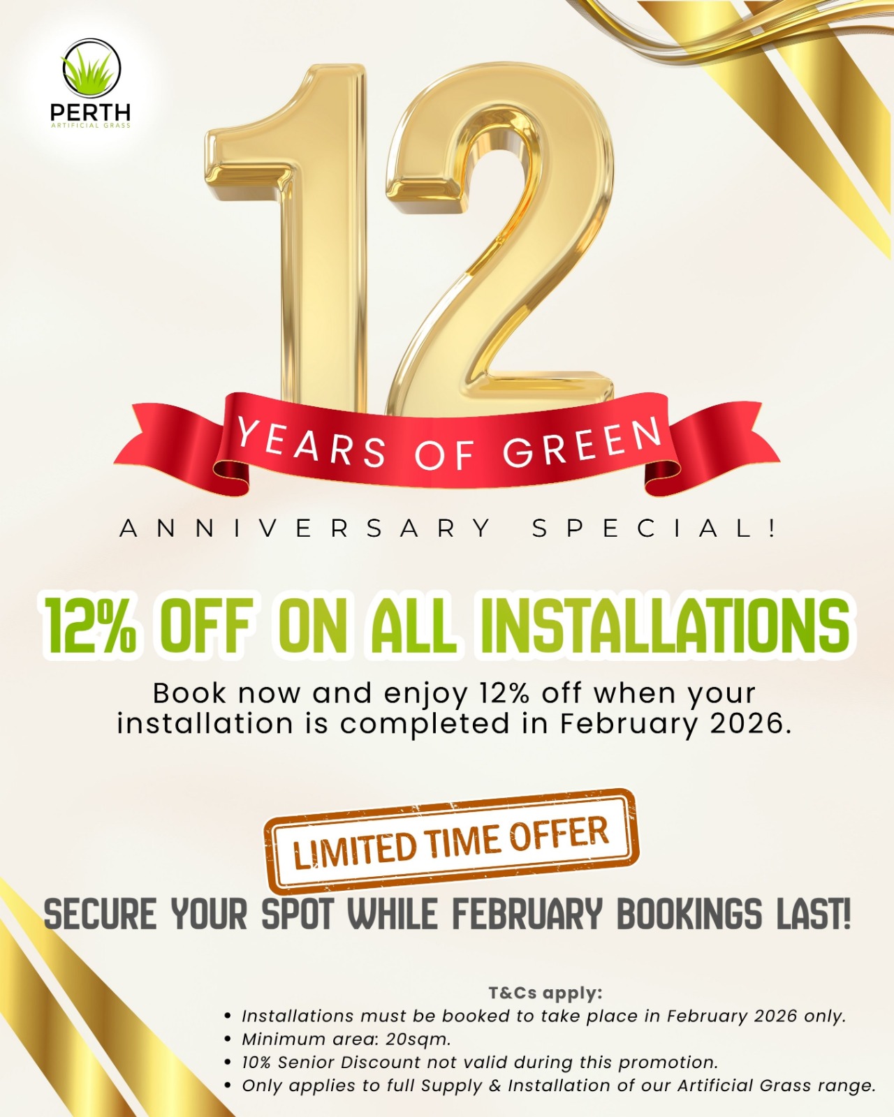 We’re celebrating 12 years of supplying and installing premium artificial grass across Perth & WA — and we’re giving back.